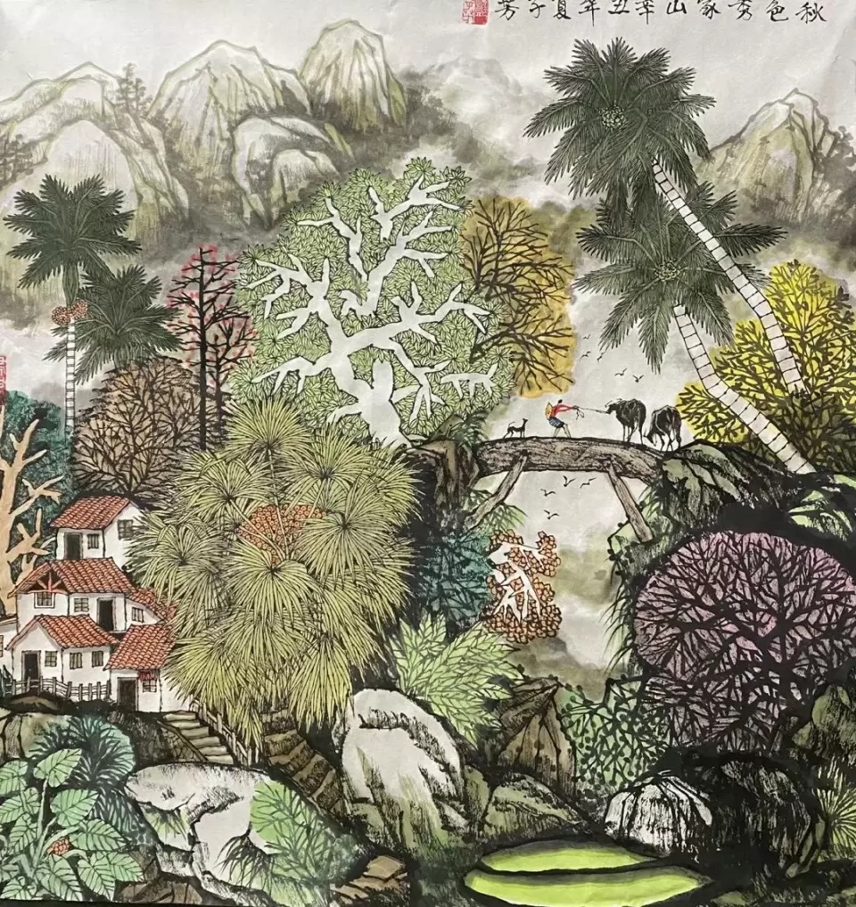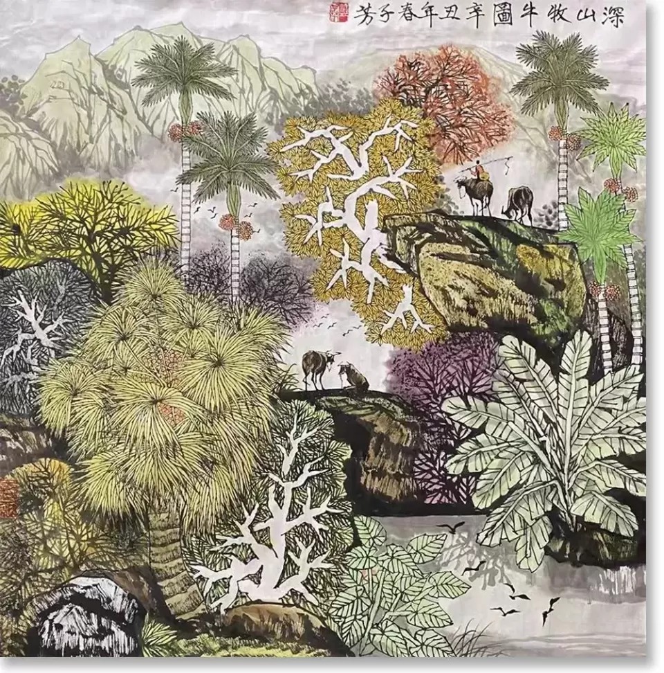 邓子芳的性情本就偏“热”,他看待世界的眼光习惯偏“阔”,这样的人自然容得下“文字传承多体变,纳新吐故自机纾”。表现在绘画艺术上,就显得“亲繁茂而远枯涩”。他的《山寨归牧图》《高山流水牧牛图》等,光是热带植物,少说些也有四五种,再加上高山、流水、层云、红衣少女、牛、房屋……黄宾虹先生曾写:“人们讲画面构图疏处可以走马,密处不使透风。我偏说密处可以走马,疏处不使透风。”邓子芳就是这么画的。他的画上云山有语,山林有笑,再幽绝处也一派生机,时有人作吟啸。