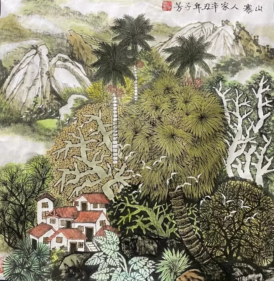 子芳的作品一如他的为人——澄明、清新、流畅而又自然。他的情感都在一笔一线的表述中,没有噱头,也不贪奇,正应了清人笪重光的话:“笔墨贪奇,多造林丘之恶境;丹青竞胜反失山水之真容。寻常之景难工,工者频观不厌;奇俏之笔易作,作之一览无余。”子芳笔下的寻常之景总是那样从容,一笔不苟地编织画面,交叉重叠,抑扬顿挫,像一位指挥家在调动着一个乐队,绿色的交响中有疏密、松紧、浓淡、奇正的辩正统一。看似单调的“绿”在他笔下也五彩缤纷了。